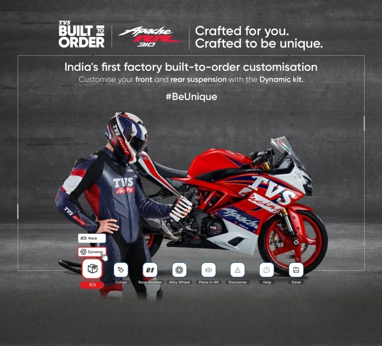 With TVS Built to Order (BTO), the TVS Apache RR 310 is the first race machine that can be crafted-to-order. To suit your unique needs, the TVS Apache RR 310 with TVS Built to Order (BTO) comes with two pre-defined customisable performance kits. Choose between these kits or choose the best of both worlds to craft your ultimate track weapon, your way.
