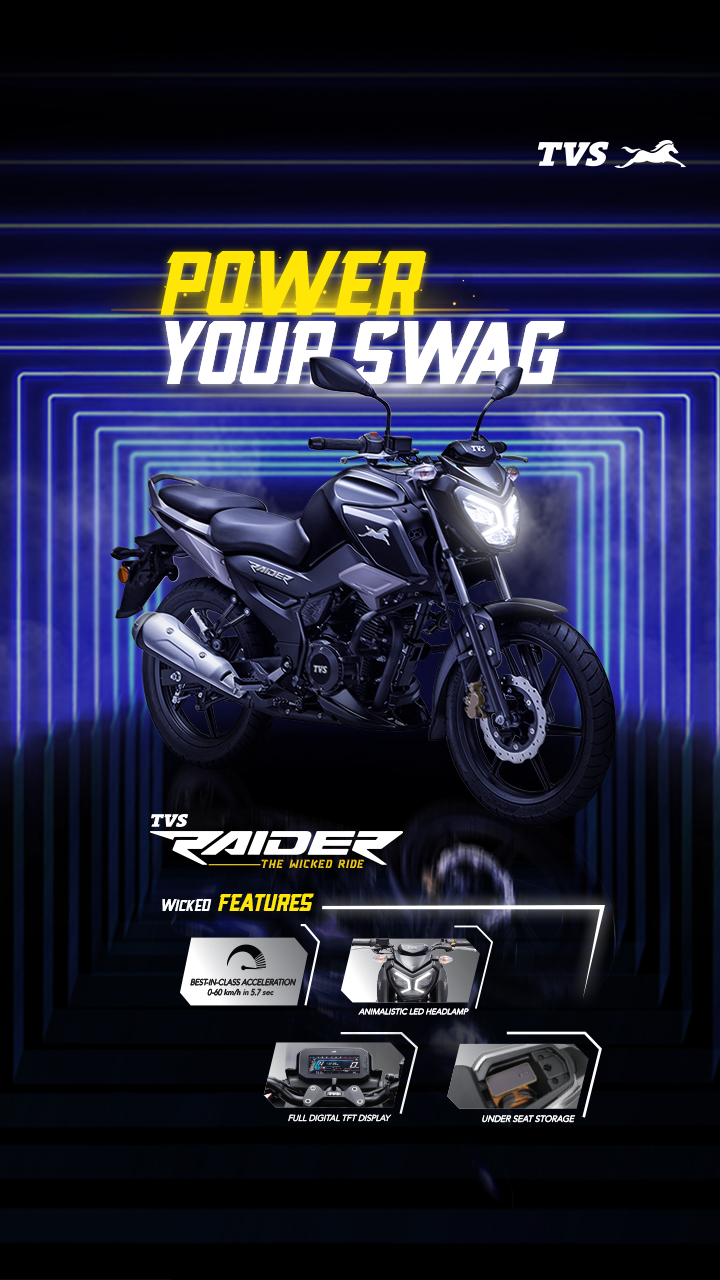 "TVS RAIDER SX - The Wicked Ride. Its time, its wicked time! Go wicked with distinct sporty styling, best in class performance and hi-tech advanced features. TVS Raider SX is a mix of comfort and styling, which makes it the best product in the segment."