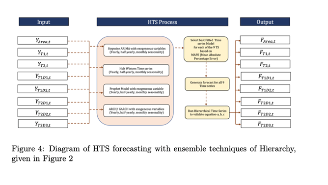 Hierarchical time series forecasting generates coherent forecasts that allow individual time series to be forecasted individually but preserve the relationships within the hierarchy. For individual time series at different granularities, we can build multiple time series models such as ARIMA (Autoregressive Integrated Moving Average), Holt- Winter, Prophet, ARCH (Auto Regressive Conditional Heteroscedasticity), GARCH (Generalized Autoregressive Conditional Heteroskedasticity) or ensemble models based on the EDA (Exploratory data analysis). The proposed solution is HTS Middle-out approach with ensemble techniques, starting from the Area-series level. Area-series level forecast would be disaggregated to generate territory-series, dealer-series etc., level forecasts and aggregated to generate zone-series etc., level forecasts.