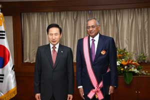 President of the Republic of Korea, His Excellency Lee Myung-bak with Mr. Venu Srinivasan, Chairman, TVS Motor Company post investiture ceremony.