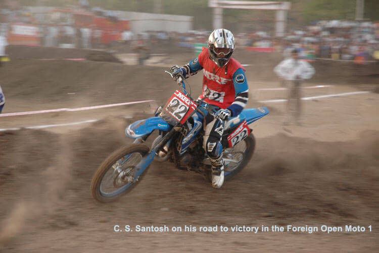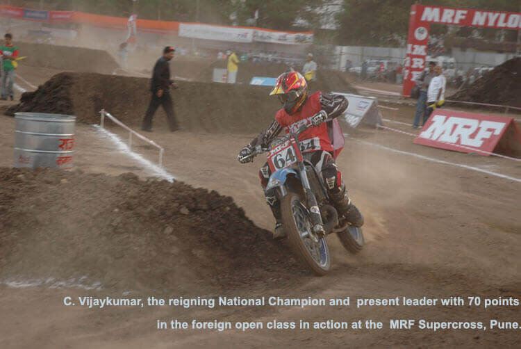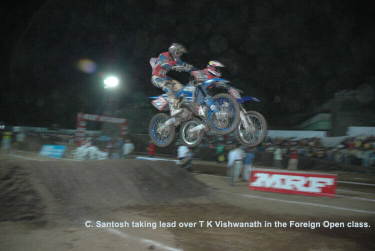 TVS Racing team continued its dominance at the second round of the MRF National Supercross Championship by winning 4 and sharing honours in the foreign open class among the total of 6 Championship classes held in floodlit Pune's Deccan College Ground, today. The foreign open class points were shared between C. S. Santosh of TVS Racing and Yamaha's Syed Eathasham. The reigning champion C Vijaykumar of TVS Racing continues to lead the championship in the prestigious 'Foreign Open class' with 70 points closely followed by C. S. Santosh with 67 and Yogesh Barguje of Yamaha with 60 points.