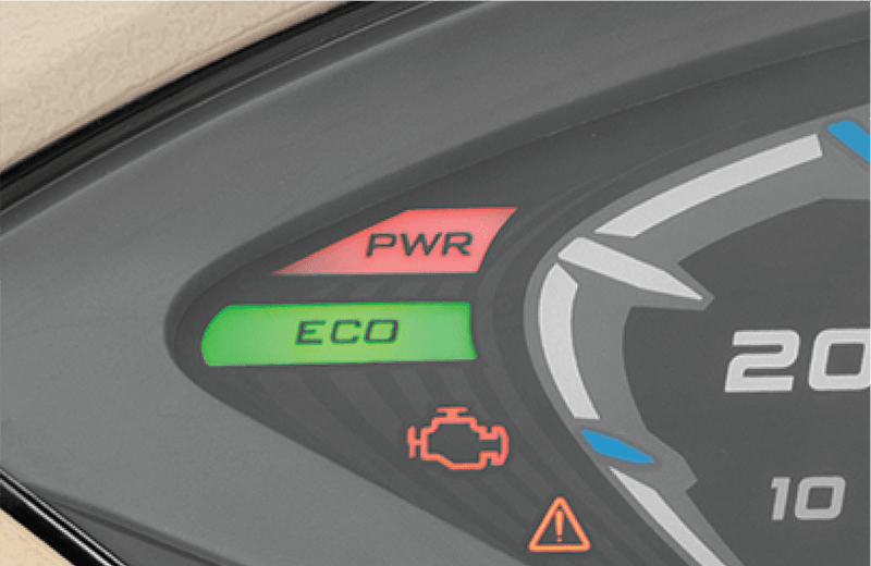 TVS Jupiter is designed to produce great fuel economy efficiently. And with a little help from you, it's even better. Advanced technology is only part of getting best-in-class mileage. Just adjust your throttle to "ECONOMY" mode and further maximize your fuel economy. With two-mode riding options "POWER" & "ECO", Jupiter gives you ample opportunity to inject a little more fun into your day.