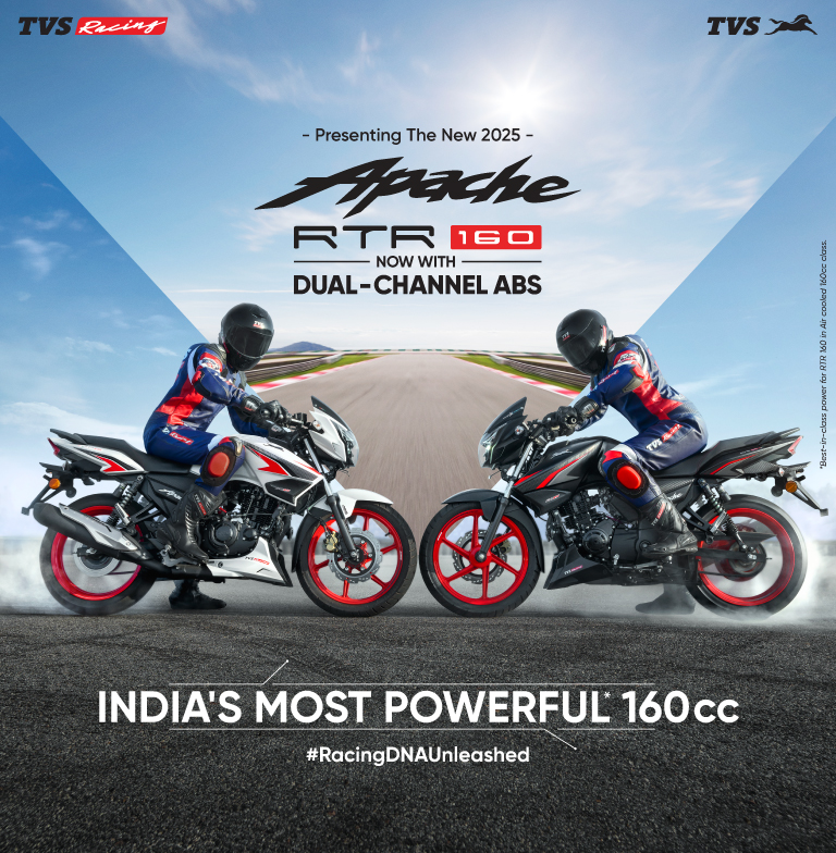 For 20 years, Apache has conquered chequered flags and climbed podiums through relentless innovation. Trusted by over 6 million riders worldwide, racing excellence has always been our foundation, and the Apache RTR 160 is the ultimate expression of it. New Dual Channel ABS and race-derived colours deliver enhanced safety and striking aesthetics, while India's most powerful 160cc engine ensures every ride commands respect on the road.