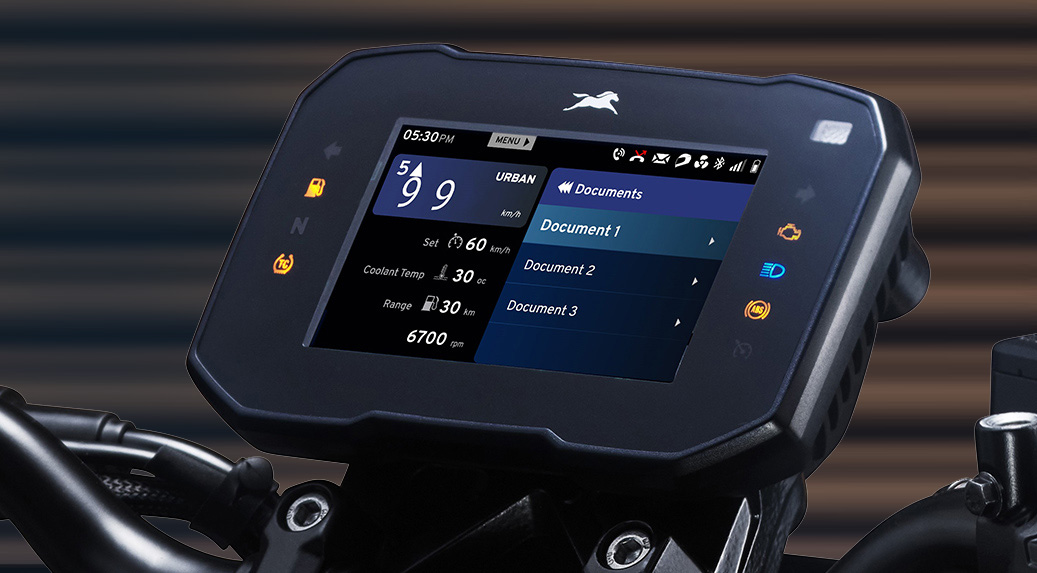 The digital command centre of the freestyler. The 5" horizontal TFT race computer puts you in control—letting you adjust traction control, cruise control, headlamp brightness, and even manage music via Bluetooth.