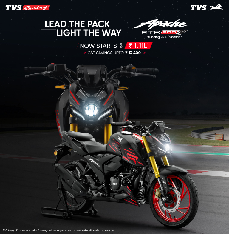 Built on Apache's 20-year legacy, the all-new RTR 200 4V elevates control with race-tuned 37mm USD suspension, an ergonomic hydroformed handlebar, Dual Channel ABS, ride modes, and 20.8 PS of power—all engineered to deliver instinctive, precision-led performance.